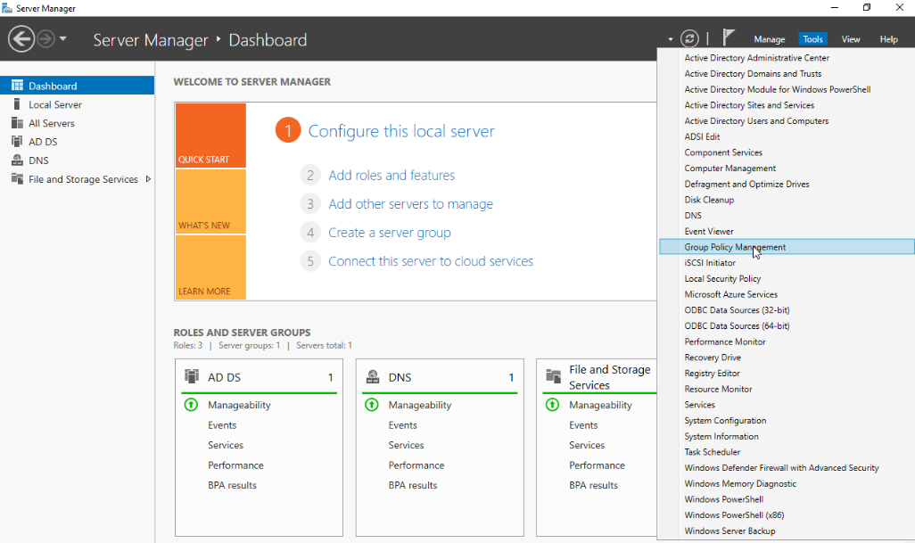- On the Server Manager click Tools on the upper right side and choose the Group Policy Management.