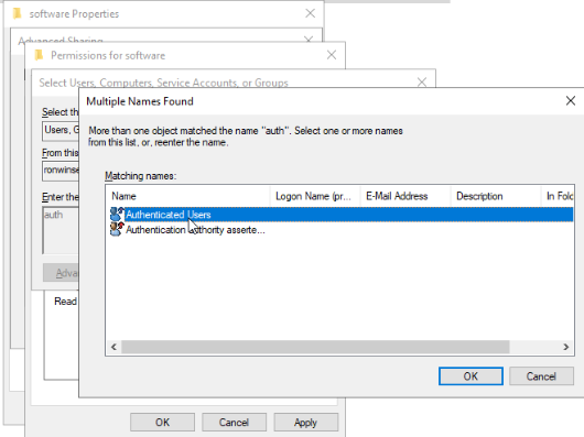 - After clicking the Remove, click the Add, then Select Users, Computers, Service Accounts, or Group will be shown. Type "auth" then click Check Names. The Multiple Names Found will be shown and select the Authenticated Users and click OK.