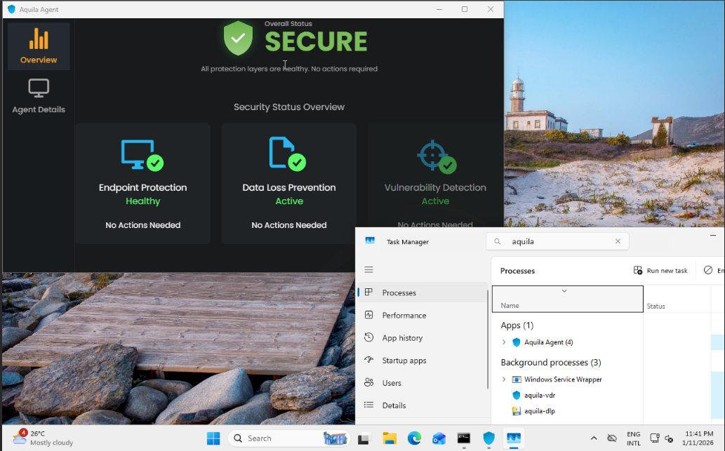 - Once the PC/Desktop is open, the Aquila Agent installer will automatically be installed, to ensure everything is running kindly proceed to task manager and type Aquila on the search bar and check the status of its module.