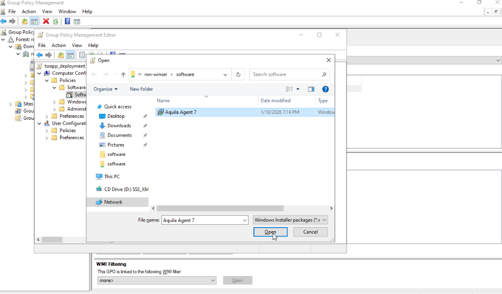 - Once you clicked the Package it will direct you from the folder you've created with a name of "software". Kindly click the Open your software installer (Aquila Agent 7 with MSI format) will be added inside to your Group Policy Management Edit or GPO. Do not change the "Assigned" option from Deploy Software.