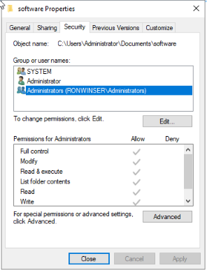 - On the software folder properties click the Security tab. Point your mouse at Administrator ("username"\administrator) and click Edit