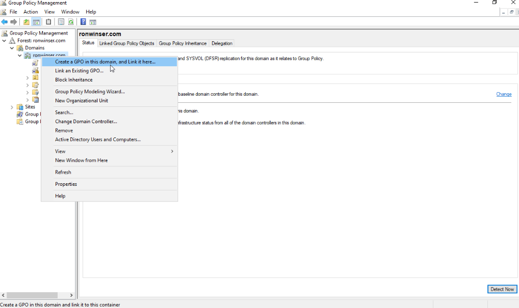 - Right click your domain name and click the Create a GPO in this domain, and Link it here and give a name