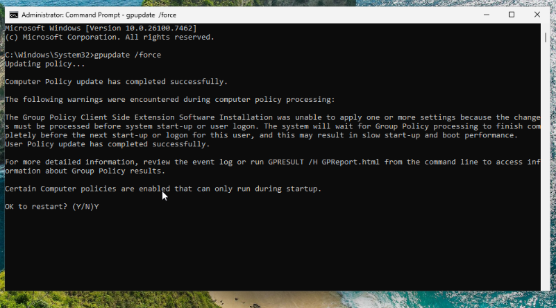 - If the group policy updates successfully, type “Y” to restart your PC. This allows your endpoint to synchronize with the GPO.