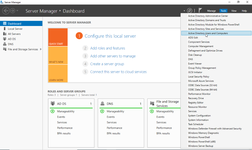 - Open Server Manager dashboard click Tools on the upper right side and choose the Active Directory Users and Computers.