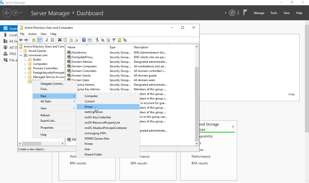 - On the Active Directory Users and Computers right click the Users folder select New and Group.