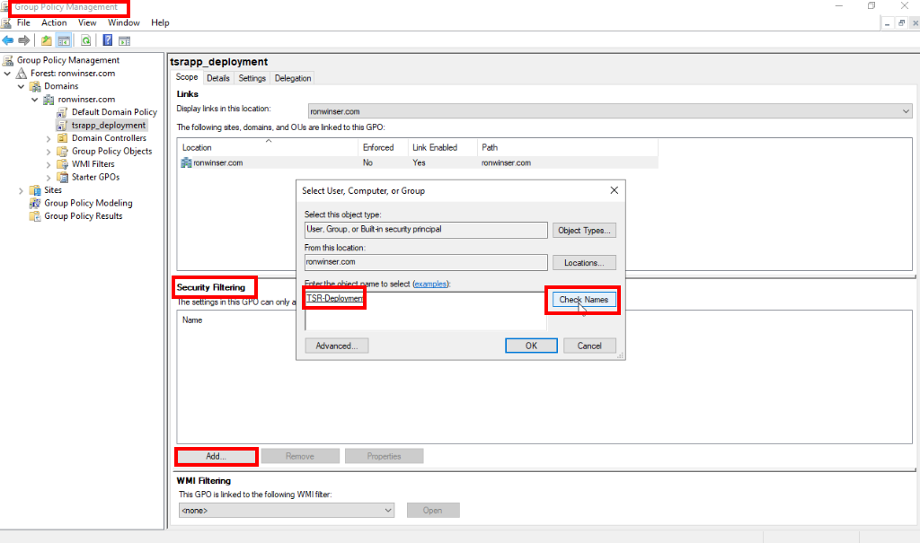 - Then click the Add button from Security Filtering, type Security Groups you've created, but for this case was "TSR-Deployment" and click the Check Names and press OK.